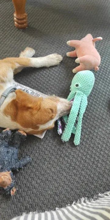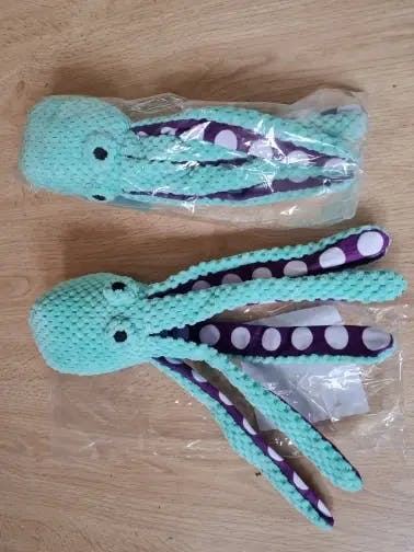 - Sons Estimulantes: Possui um apito (squeaker) embutido na cabeça que soa ao ser mordido, além de papel sonoro crocante (crinkle paper) dentro de cada um dos 8 tentáculos. Cada movimento gera um barulho diferente que enlouquece os cães de alegria.